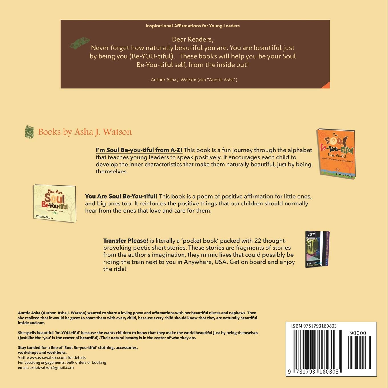 This is a book of loving ways to affirm the things about children that make them beautiful from their soul! You Are Soul Be(you)tiful is a book of positive affirmations, and a call to action, for adults to help children acknowledge and develop their inner beauty from the beginning! It focuses on character traits that are both natural, and developed to help children them be themselves and be Soul Be(you)tiful!